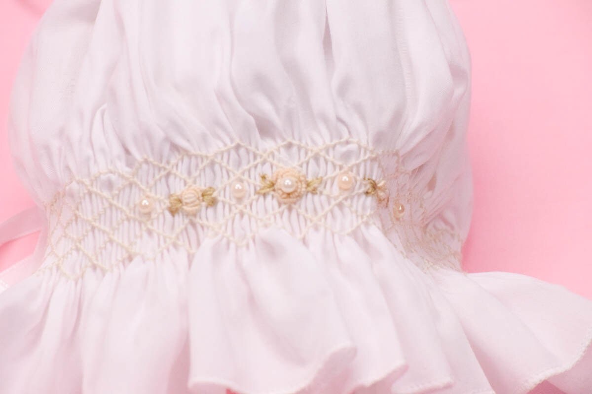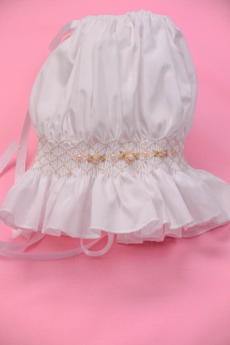 Smocked Bonnets make a great gift for many occasions, baby shower gifts, Christenings, Baptisms, Easter... Multiple sizes available. Matching diaper covers can also be purchased. Shades of blue, ecru and pinks may appear a shade lighter or darker in the picture due to lighting and phone coloration. The bonnet in the photo is smocked in ecru.