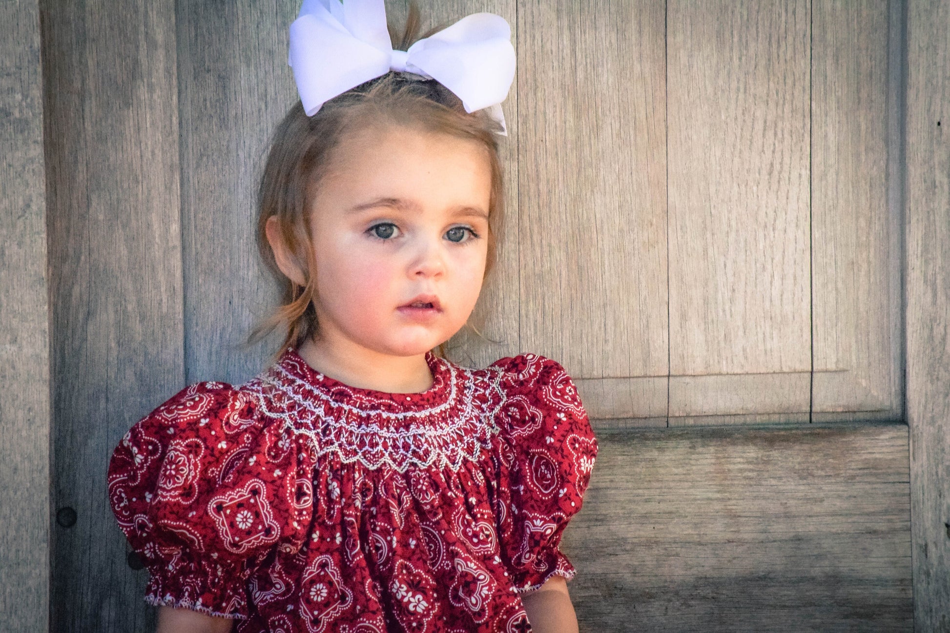 Red bandana dress, smocked in white. Many sizes available. This fabric is very durable, wears well, very sturdy fabric. It’s a longer style dress which is great for many months of wearing as they grow so fast. This dress is short sleeve trimmed in white and smocked all the way around to the back.